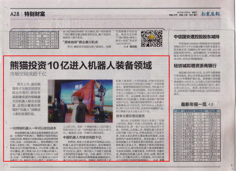 《南京晨报》A28-熊猫投资10亿元进入机器人装备领域