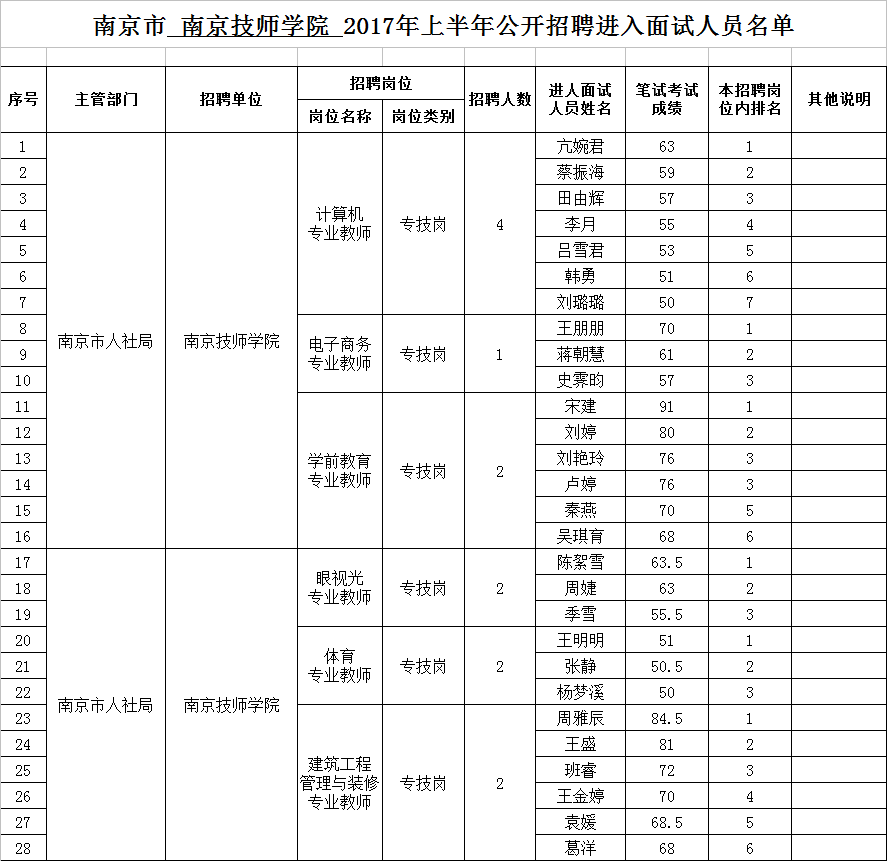 南京市 米兰平台 2017年上半年公开招聘进入面试人员名单
