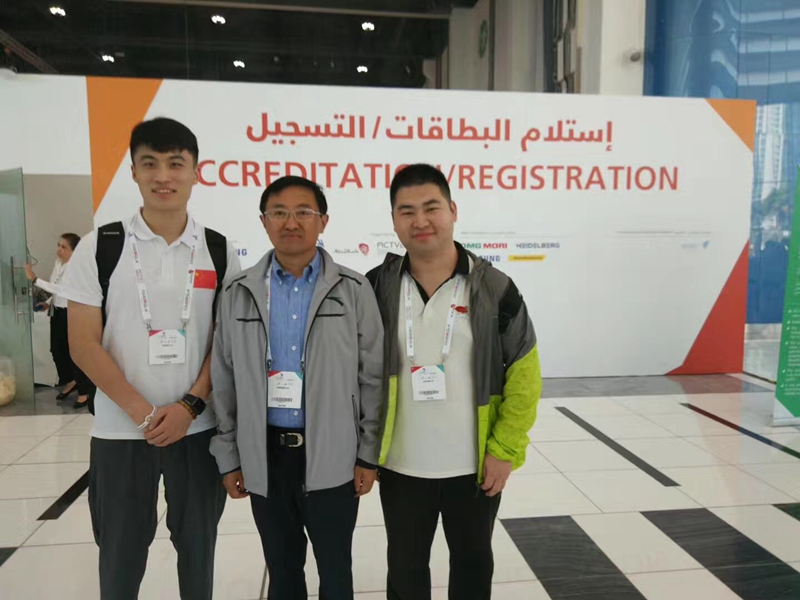 省人社厅朱厅长和我院国家队教练徐才广、国家队选手刘人豪在阿布扎比世赛赛场亲切合影