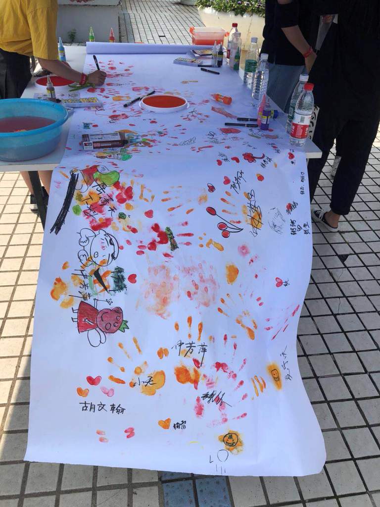 我们准备了10米长的梦想画卷,安全无毒的手指画颜料,邀请大家一起完成我们的梦想,并留下爱心指纹和签名。