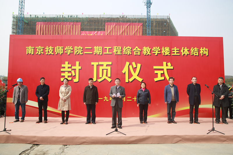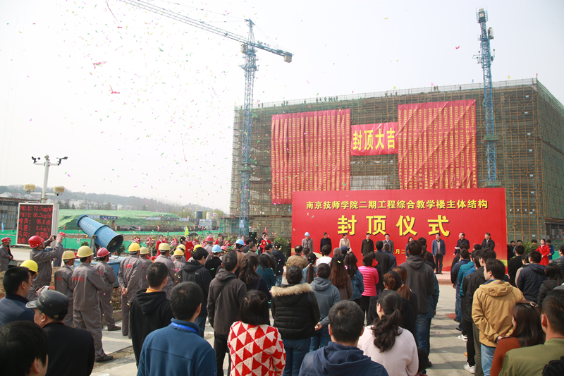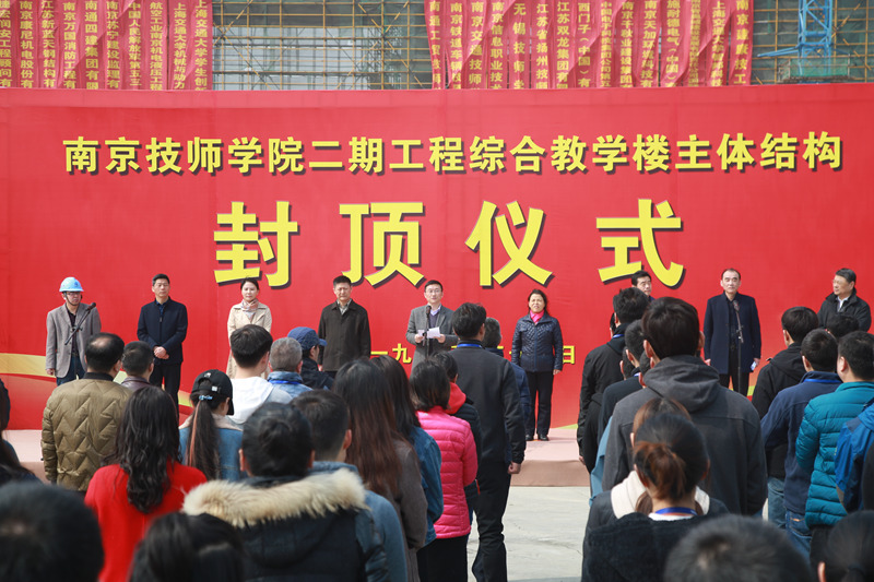 3月24日上午,米兰平台举行二期工程综合教学楼主体结构封顶活动。市人社局党组书记、局长刘莅,仙林大学城管委会党工委委员、副主任孙金娣,市人社局巡视员周政学,副巡视员郁永春,江苏省建筑设计研究院有限公司、南京苏宁建设监理有限公司、南通四建集团有限公司等参建单位负责人以及学院部分教职工代表约100人参加活动。