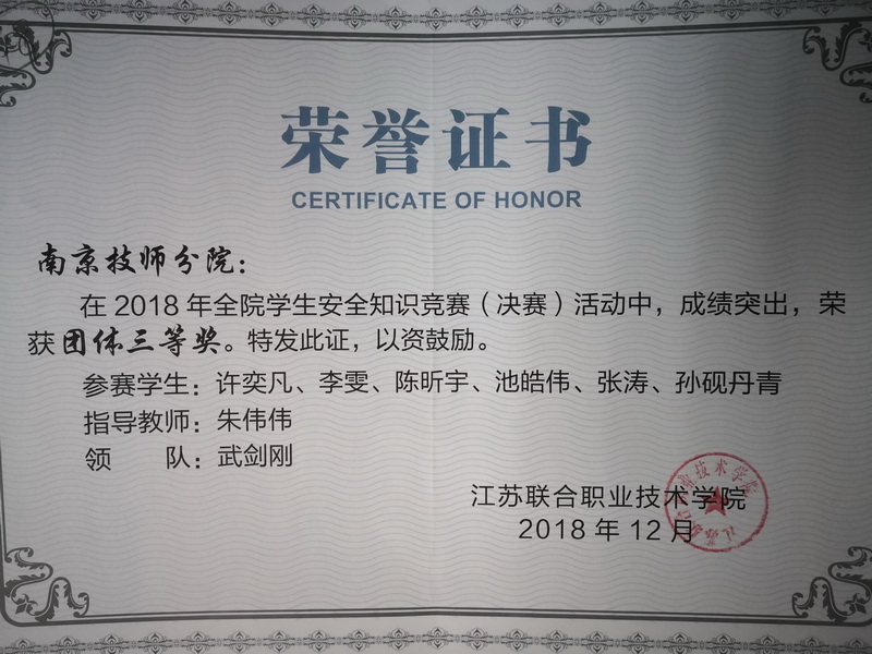 2018年度,我院共12人获得文明标兵、6人获得技能典型、2人获得维修典型、3人获得学生活动典型的荣誉称号,获得2018年江苏联合职业技术学院安全知识竞赛决赛团体三等奖学生6人,个人三等奖9人。