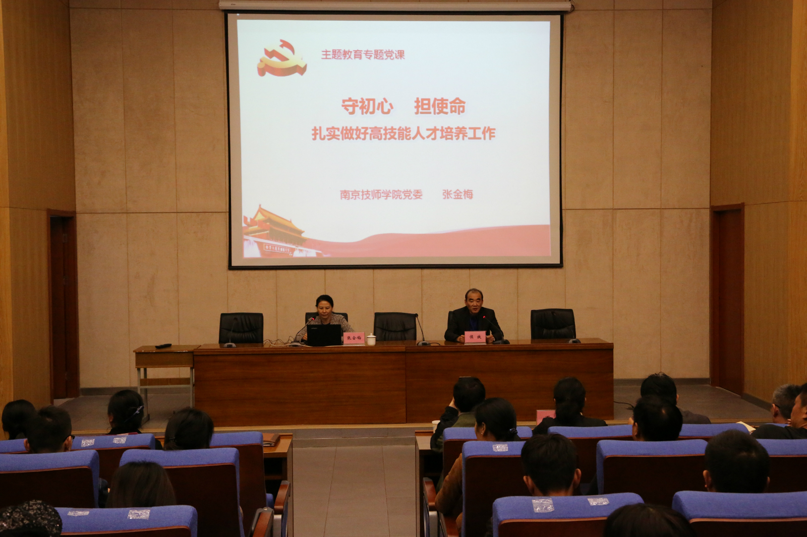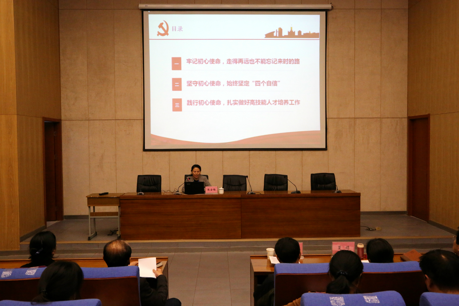 为深入开展“不忘初心、牢记使命”主题教育,不断增强党员守初心、担使命的思想和行动自觉,11月6日下午,学院党委书记张金梅以《守初心,担使命,扎实做好高技能能人培养工作》为题上主题教育专题党课。市第七巡回指导组蒋振洋科长、夏娟科长莅临指导。侯放院长主持会议。全体党员、中层以上领导干部、教务员、学管员、教研组组长参加会议。