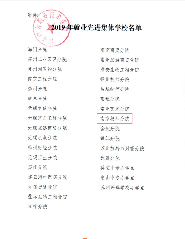 在江苏联合职业技术学院2019年就业工作先进集体评选中,学院被评为“2019年就业工作先进集体”(苏联院招【2020】6号)。2019年,学院认真落实联合学院实习就业工作要求,坚持以服务教学、专业建设、人才培养为基础,以加强校企合作深度融合为方向,以提高就业率及就业质量为落脚点,增强学生的创新创业意识和实践能力,不断提升毕业生的就业率及就业质量。在院领导的关心指导下,经过招就处(校企合作办)、各系(部)和2019届毕业班班主任的共同努力,学院2019年五年制高职毕业生初次及年终就业率均为97.9%学生满意率为93.3%,雇主满意率达95%。