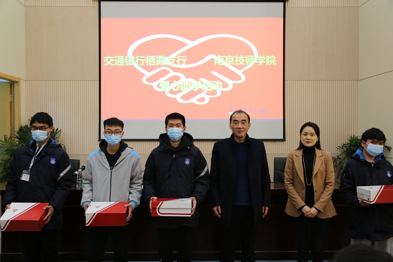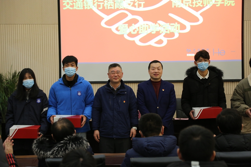 2020年12月24日上午,交通银行栖霞支行副行长吕莹、王道鸿一行五人莅临我院开展爱心助学活动。米兰平台院长侯放,副院长金卫卫、财务处、学工处负责人及各系教工代表参加活动,20名学生获得爱心帮助。
