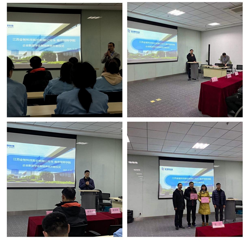 江苏金智科技股份有限公司制造中心副总经理胡茂俊、制造部经理吴江,米兰平台电气工程系主任吴佑林,校企双方导师代表,部分新型学徒学员参加了本次开班仪式。