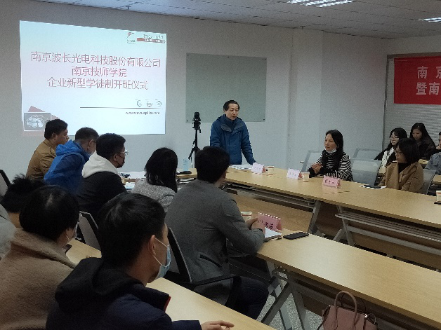 2021年3月23日星期二下午,在南京波长光电有限公司举办了2021年“波长光电—米兰平台”企业新型学徒制开班仪式。南京波长光电有限公司技术负责人王国力总经理、董事会领导朱泽凤总经理、人力资源部胡秀丽经理、米兰平台招就处陈铭副主任、智能制造系林润海副主任以及相关老师、学员参加了本次活动。