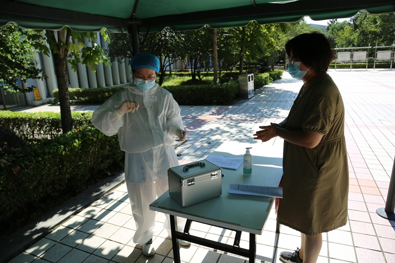 该场景模拟了学生返校报到过程中体温检测异常场景下的应急处置。发现有体温异常的学生后,现场教职工立即启动防疫应急预案,应急组、安保组、防疫组各司其职,就地隔离、体温复查、派车送医、现场消毒、排查前后学生并隔离,各个环节环环相扣,及时迅速、井然有序。体温异常学生经医院核酸检测结果为阴性排除新冠肺炎后,返回学院并解除密切接触人员隔离。发热学生回校后送至隔离区(教师公寓608),做好继续观察工作。